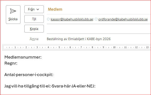 I inbjudningsmejlet som du skickar till kassören anger du om du vill ha el. Så här ser inbjudningsmejlet ut som du skickar in via länken i inbjudan. Är det så att du inte får fram inbjudningsmejlet när du klickar på länken BESTÄLL kan du manuellt skicka mejl själv med det innehåll som finns nedan.